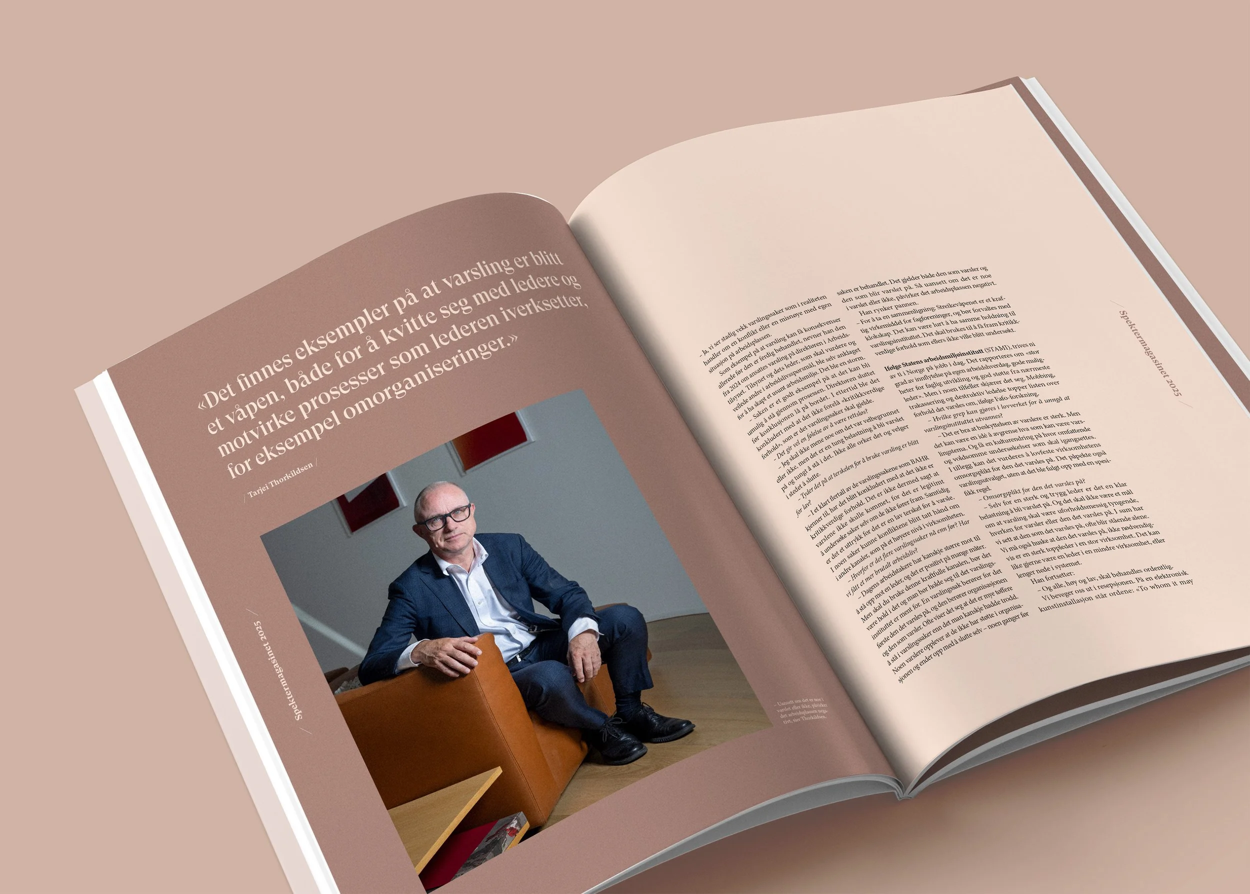 Jeg har redesignet årets Spektermagasin (2025) med ny layout, fargepalett og font. Temaet for årets magasin er omstilling i arbeidsgiverpolitikken, rammebetingelser og reformer som påvirker bedriftsledelse. Gjennom en rekke dybdeintervjuer kommer profilerte ledere med refleksjoner om politiske prioriteringer og godt lederskap i vår tid. Foto er en sentral del av layout, og bildene er tatt av Thomas T. Kleiven. De tre hovedfargene, grønn, blå og brun, som benyttes i layouten, er inspirert av de mest gjennomgående fargetonene i bildeutvalget. Layout er luftig og lett med kontrastfulle, men samtidig jordnære, farger, som fremhever motivene i bildene. Typografiske grep i titlene poengterer tematikken i artikkelen.