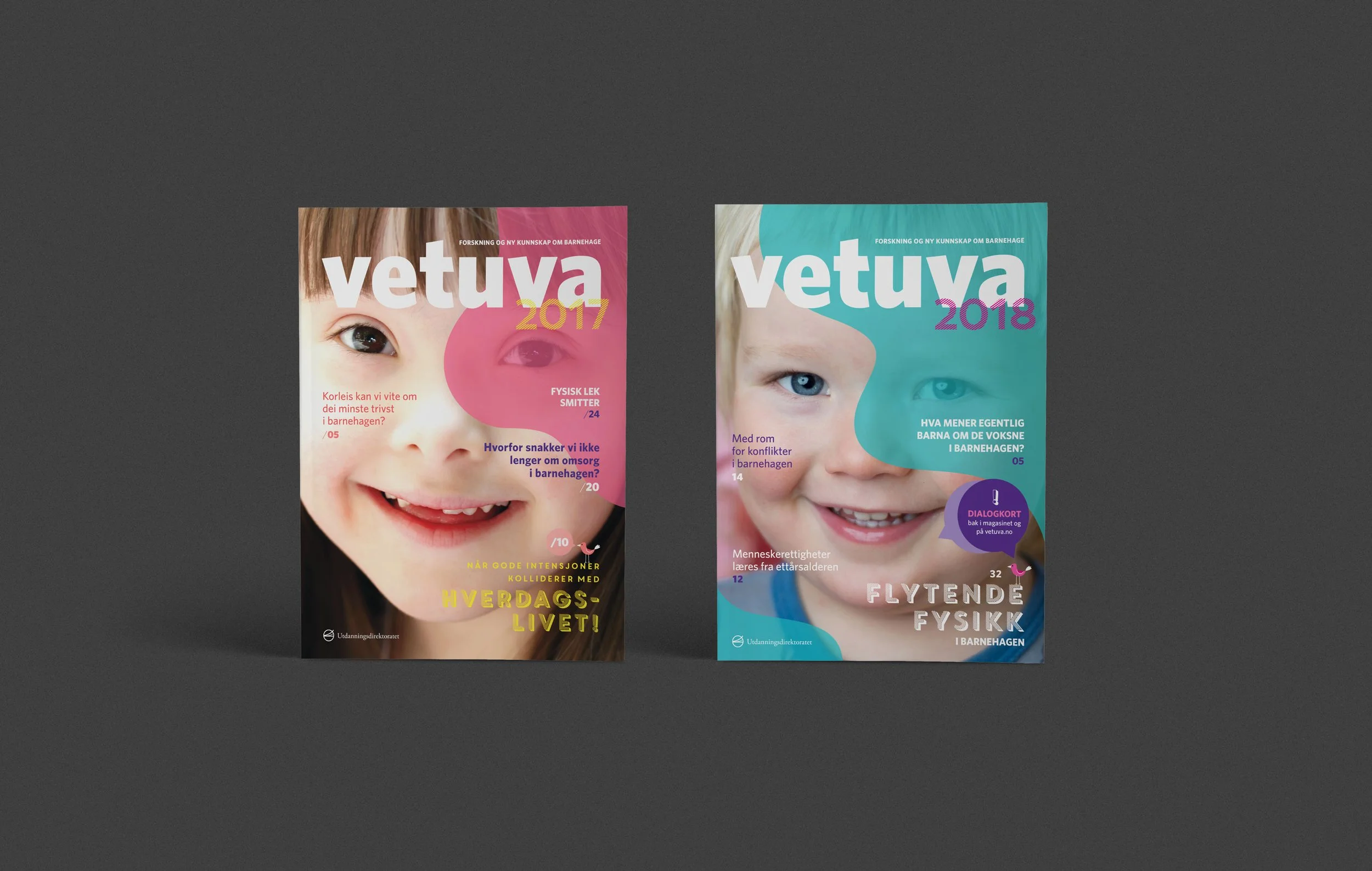 Vetuva er et forskningsmagasin for alle som jobber i barnehagen. Magasinet utgis av Utdanningsdirektoratet og baserer seg på resultatene fra kvalitetssikret skandinavisk forskning om barnehager. Magasinet finnes både i trykket og digital utgave. I 2018-utgaven har jeg stått for design, layout og illustrasjon, både av den trykkede og digitale utgaven av magasinet. Det visuelle uttrykket er lekent, med aktiv bruk av bilder og illustrasjon – for å tilgjengeliggjøre forskningen på en lettfattelig måte, men også for å reflektere innholdet og tematikken best mulig.